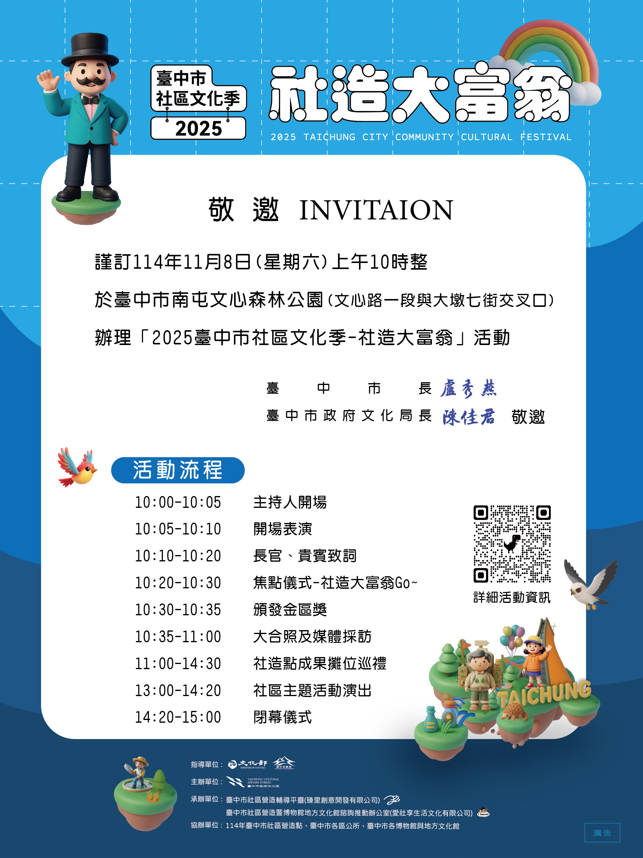 為展現臺中市社區營造成果,串聯114年度社造點、各區公所、社區大學等,共同呈現社區的主題特色,於本市文心森林公園南側溜冰場(文心路一段與大墩七街交叉口)上午 10時至15時舉行,歡迎踴躍參加。詳情請參見活動專頁(連結網址如下,另開新視窗)。