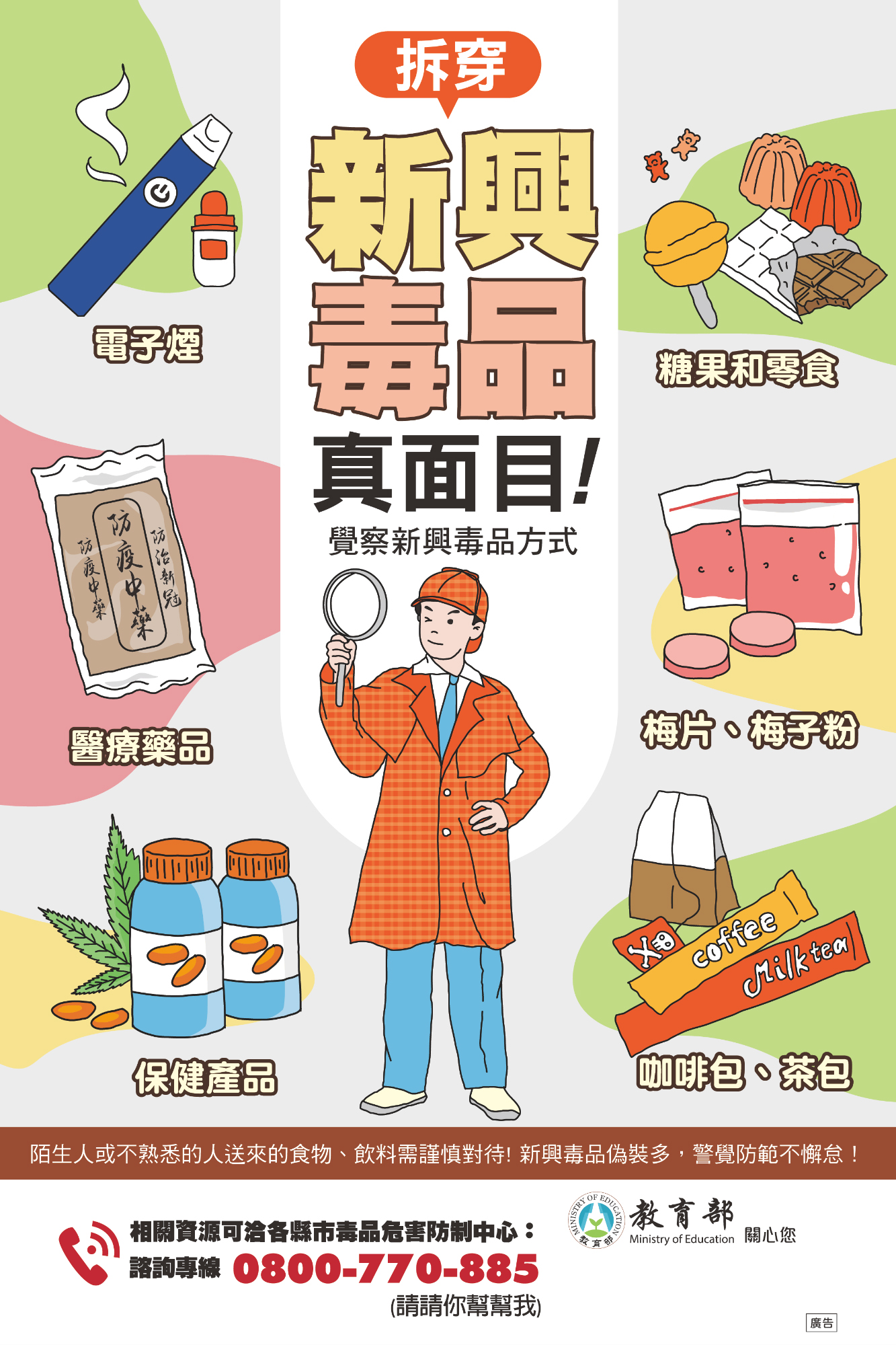反毒電子海報-覺察新興毒品方式 不論是在學校、KTV、夜店或其他場合,有人想請你/妳吃東西或喝飲料都要注意!包裝新穎、造型可愛、五花八門的咖啡包、茶包、糖果等,小心其實是包著糖衣的毒藥,一不小心就深受其害!! 保護自己不掉入陷阱:看到重新密封、標示不明的不要吃,避免出入風險場所,拒絕威脅利誘、情緒勒索,有需求並請洽詢毒品危害防制中心24小時諮詢專線:0800-770885。