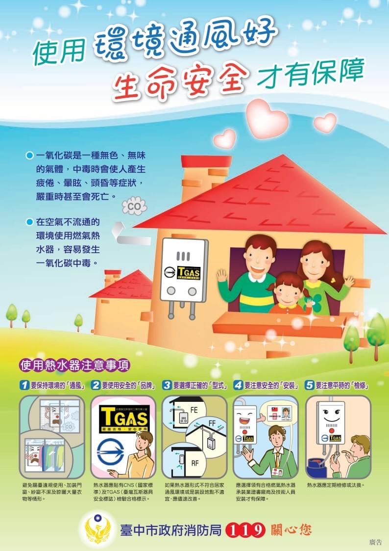 防範一氧化碳中毒宣導海報 防範一氧化碳中毒 需從居家安全做起 正確安裝熱水器 保持通風可保命 使用熱水器注意事項: 1.要保持環境的通風「通風」 2.要使用安全的「品牌」 3.要選擇正確的「型式」 4.要注意安全的「安裝」 5.要注意平時的「檢修」