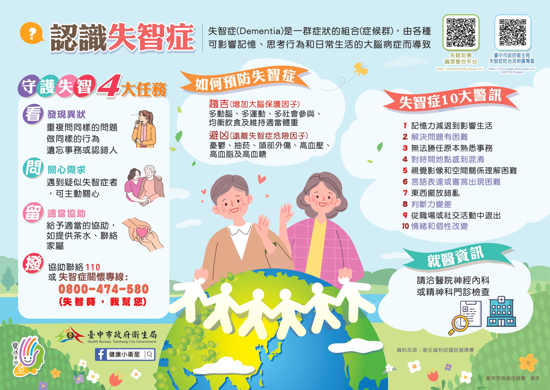 臺中市政府衛生局-認識失智症 發現家中長輩開始經常忘東忘西、搞不清楚時間地點、認錯人嗎?小心失智症悄悄找上門!注意失智症10大警訊、平常做到趨吉(多動腦、多運動、多社會參與、均衡飲食及維持適當體重)、避凶(憂鬱、抽菸、頭部外傷、高血壓、高血脂、高血糖),還需要他人的關心看、問、留、撥失智症關懷專線:0800-474-580