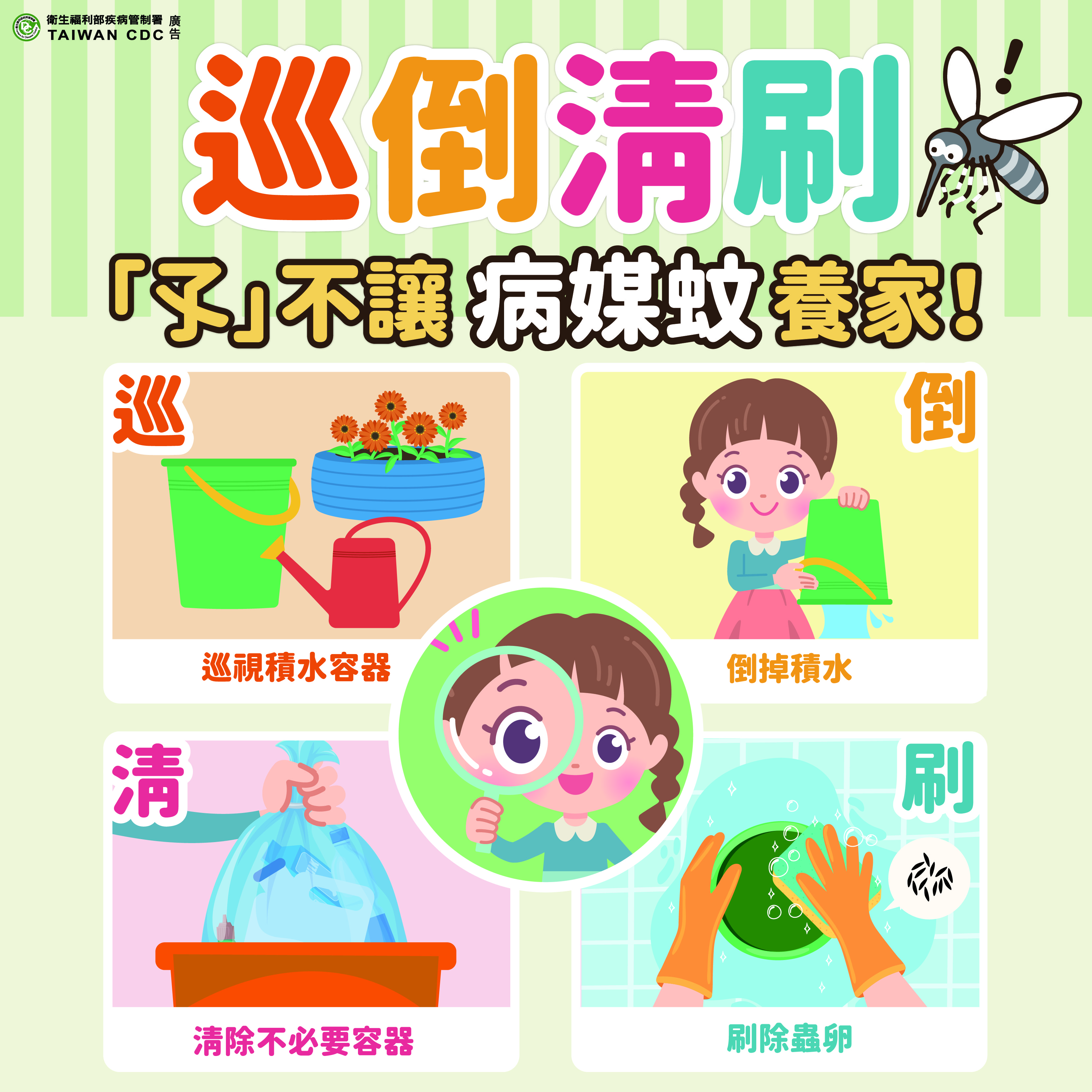小時內應主動巡檢戶內、外環境,澈底清除積水容器,落實「巡、倒、清、刷」以降低病媒蚊密度