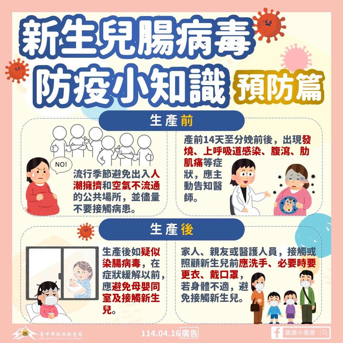 預防新生兒腸病毒生產前後注意事項 生產前 流行季節避免出入人潮擁擠和空氣不流通的公共場所,並盡量不要接觸病患。 產前14天至分娩前後,出現發燒、上呼吸道感染、腹瀉、肋肌痛等症狀,應主動告知醫師。 生產後 生產後如疑似感染腸病毒,在症狀緩解以前,應避免母嬰同室及接觸新生兒。 家人、親友或醫護人員,接觸或照顧新生兒前應洗手、必要時要更衣、戴口罩,若身體不適,避免接觸新生兒。