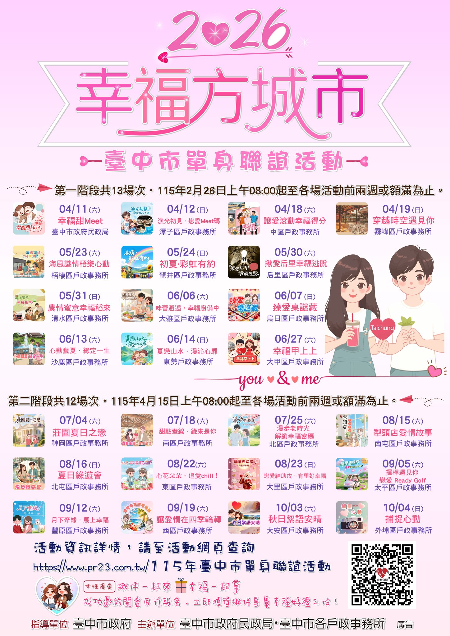 本市「2026幸福方城市」單身聯誼活動共計辦理25場,第一階段13場將於2月26上午8時起開放報名至各場活動前兩週或額滿時截止。相關報名條件請見報名網站查詢(連結網址如下,另開新視窗),歡迎單身朋友踴躍報名參加。