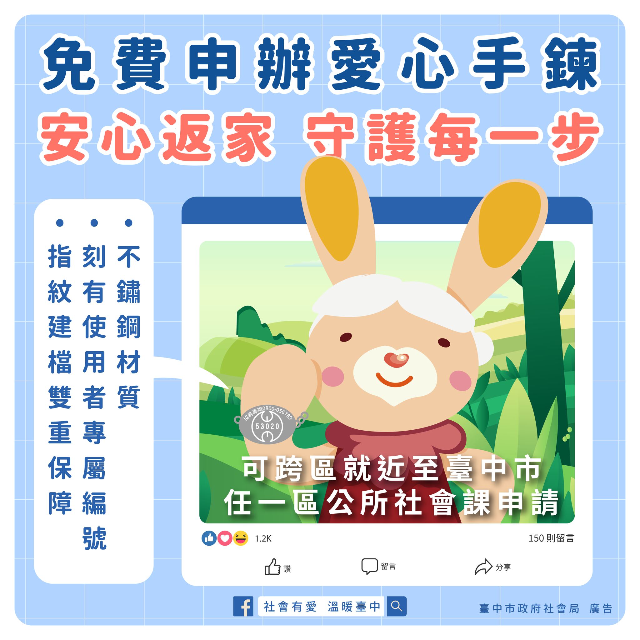 愛心手鍊宣傳圖卡 本市提供有走失之虞(領有失智症、精神障礙、智能障礙及自閉症身心障礙手冊者)的長者免費申請愛心手鍊,並與老人福利推動聯盟之全國老人失蹤協尋中心合作,如遇使用人走失情形,服務中心可經由通報者告知手鍊號碼後查詢其詳細資料,儘速協助聯絡家屬。其他詳情請見海報。