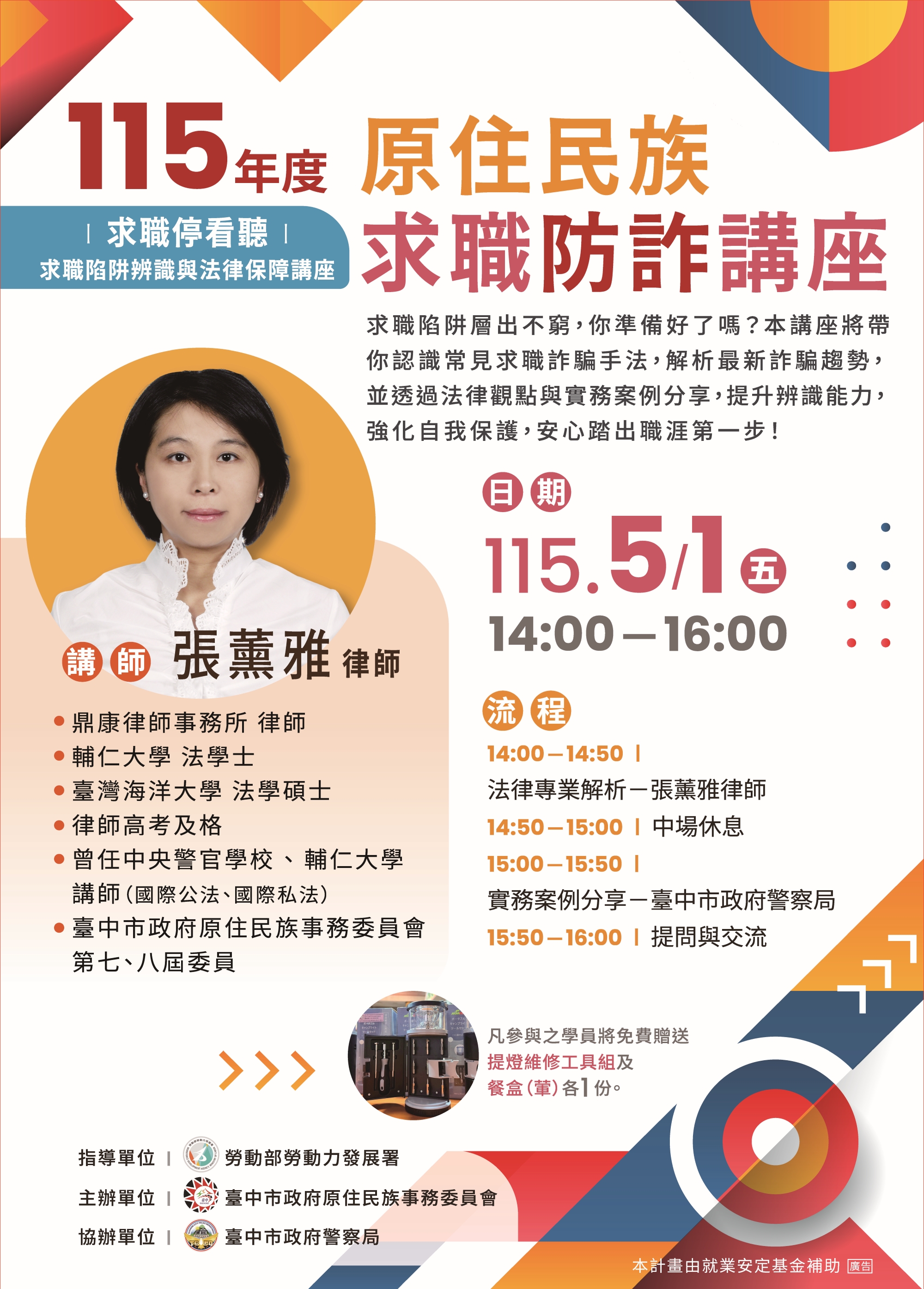 臺中市政府原住民族事務委員會為強化本市原住民族人求職防詐意識,並透過實務案例解析提升其辨識能力及自我保護能力,辦理「115年度原住民求職防詐講座」,日期及地點如下: